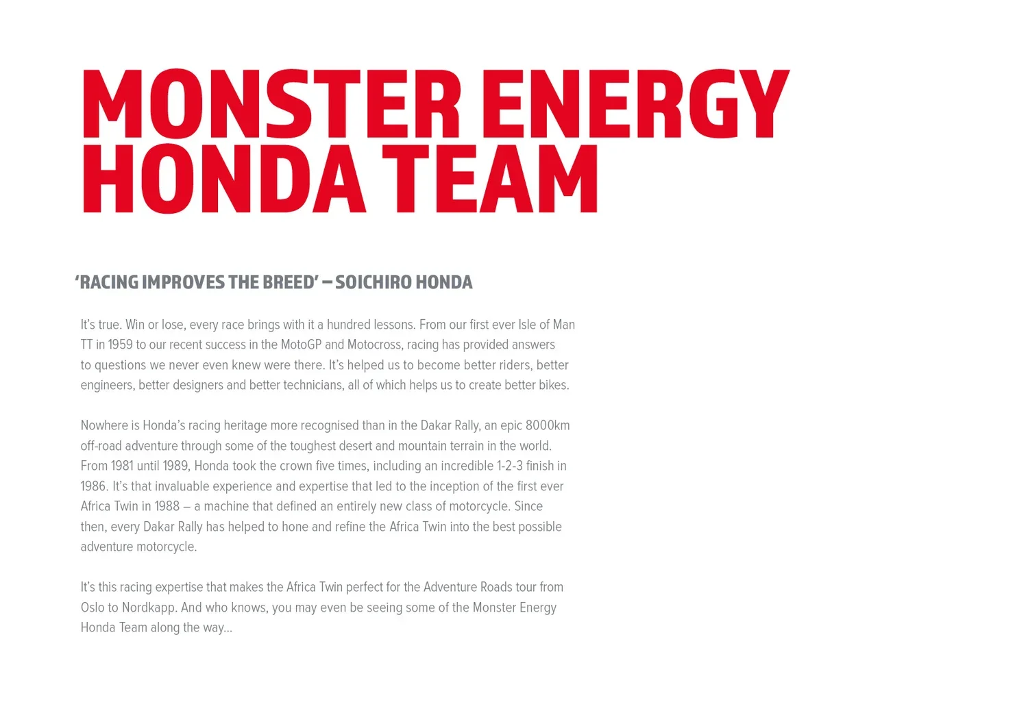 Instead, I worked with a digital designer to create a beautifully-presented coffee table book entitled Adventure Roads. It took people on a visual journey through winding roads and stunning mountain vistas. This was peppered with details about the bike and its rich heritage, highlighting the magnitude of the adventure while showing that the Africa Twin was the perfect bike to take you there. We also produced a press ad, encouraging people to follow the adventure online.